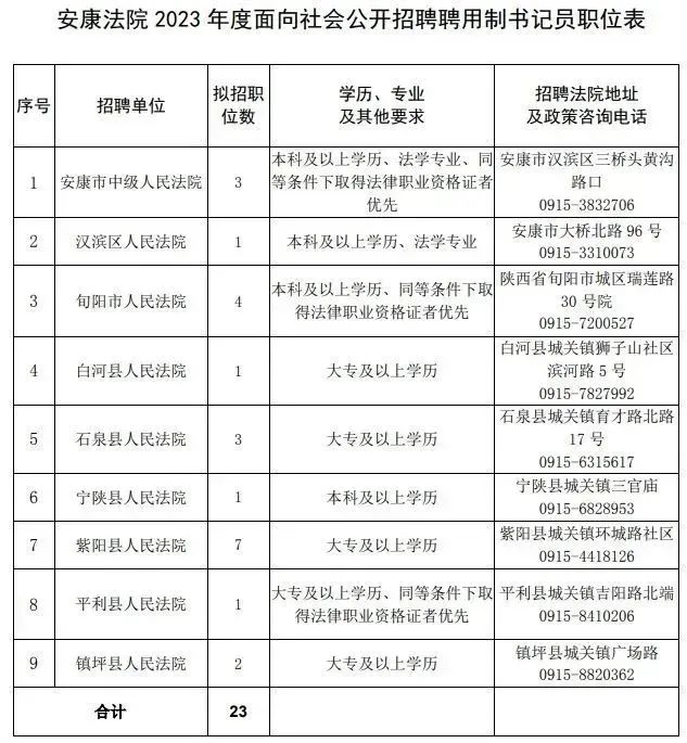 全市法院共招聘聘用制書記員23名,各法院招聘職位、地址及政策咨詢電話詳見(jiàn)《安康法院2023年面向社會(huì)公開(kāi)招聘聘用制書記員職位表》(附件)。